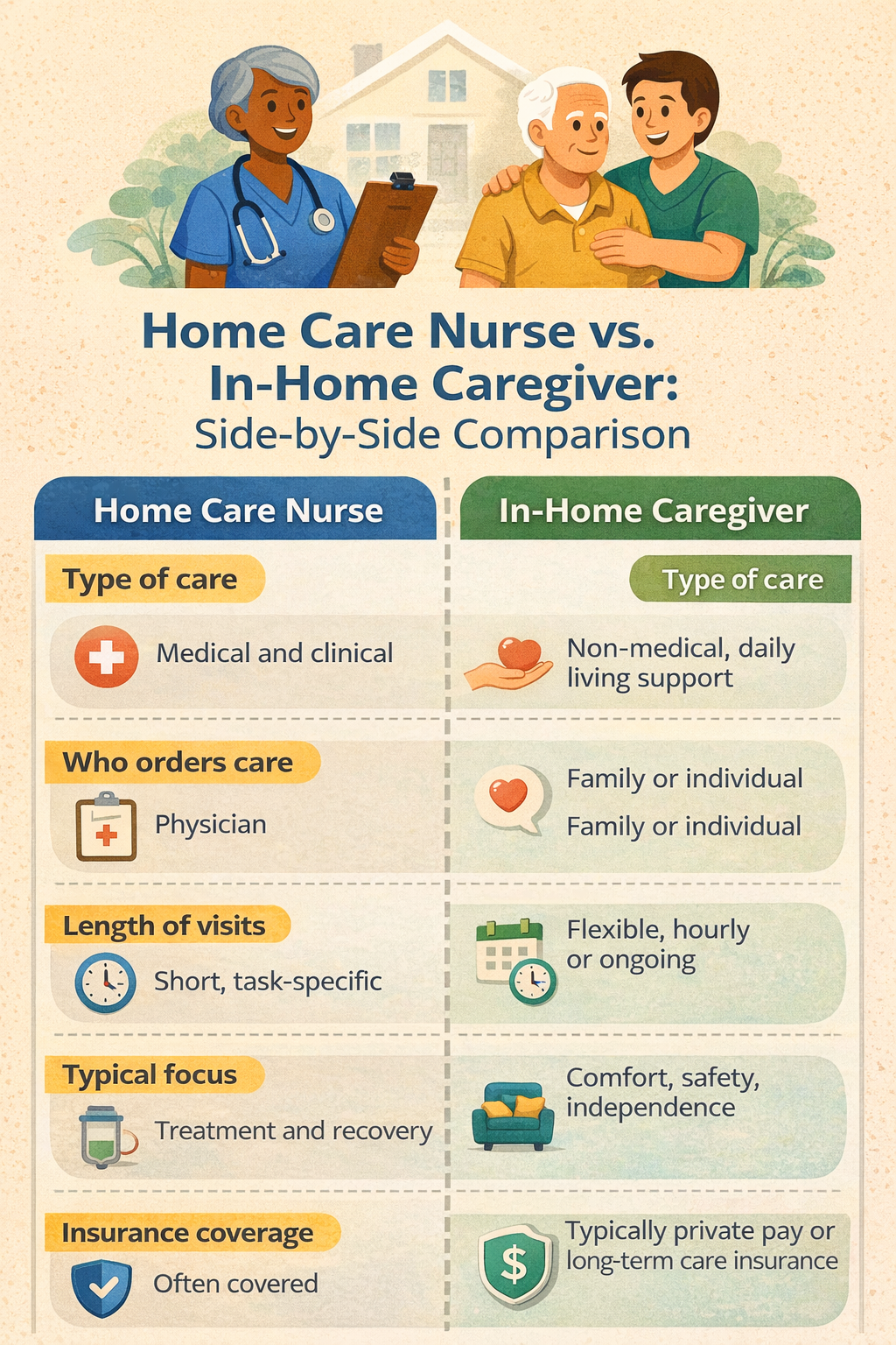 | Category | Home Care Nurse | In-Home Caregiver |