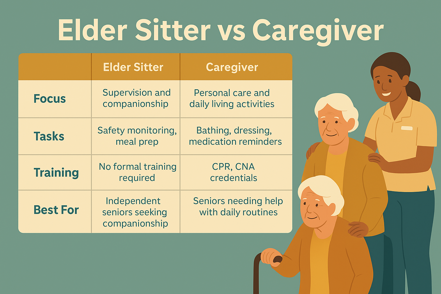 Choosing between an elder sitter and a caregiver depends on your loved one's current needs. If your parent or grandparent is fairly independent but you worry about them being alone, an elder sitter can provide peace of mind. If they need help with personal care, mobility, or health-related tasks, a caregiver is the safer and more practical choice.